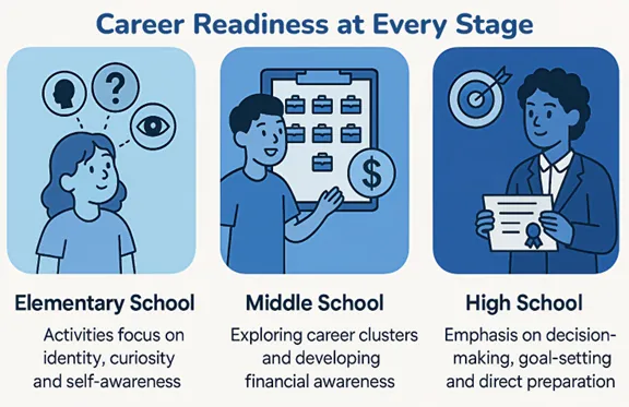 Research suggests that the ideal time to introduce future-planning concepts is late elementary school, where activities focus on identity, curiosity, and self-awareness. In middle school, students can begin exploring career clusters. This is also an ideal time to start developing financial awareness and begin connecting interests to high school pathways. At the high school level, the emphasis shifts to decision-making, goal-setting, and direct preparation through college planning, interviewing, and real-world simulations.