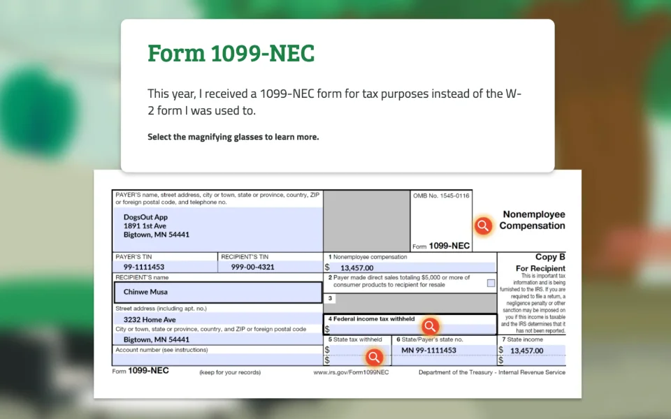 Students help a character manage her gig economy tax burden by filing her taxes using a 1099-NEC form and making estimated tax payments going forward.